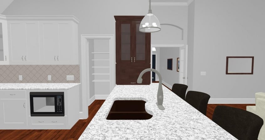 Our improved floor plan shows a more efficient layout by closing off the walkway and removing the bar between the dining room and kitchen, creating a spacious new pantry. The existing walk-in pantry was removed from the corner, allowing the cabinetry and counters to continue around the corner to the new pantry door. The new location of the refrigerator also provides more counter space in it’s previous corner, and prevents unwanted traffic from crowding the kitchen.