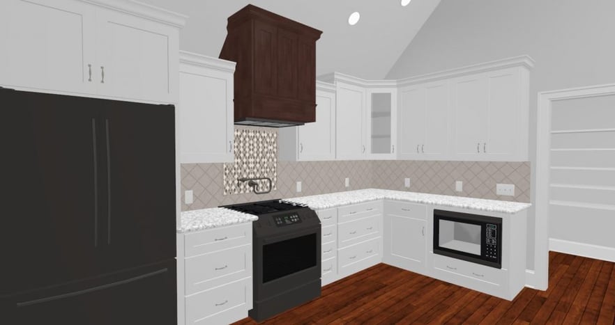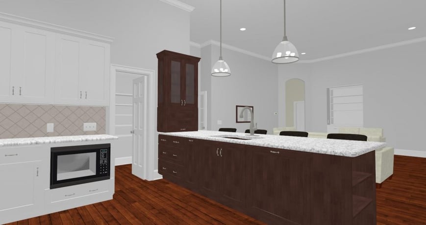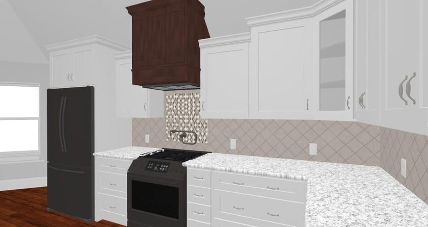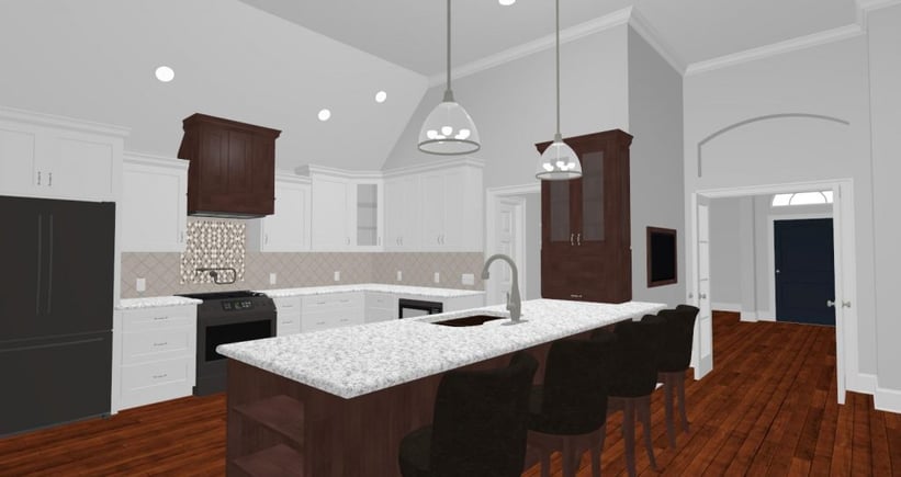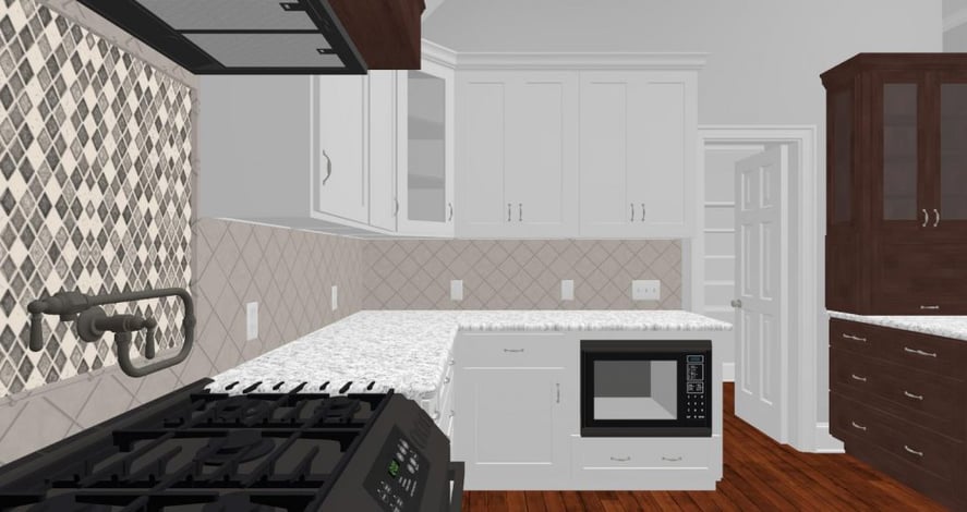 Once our designers discussed the layout issues with our clients, our draftsmen got to work creating the elevations and 3D renderings of the new kitchen. This is always a challenging, yet rewarding part of the process for us, as we are able to take the notes and inspiration photos provided by the clients and create a visual to bring their vision to life. The photos and measurements taken during the initial consultation allow us to draw a replica of the existing space and then manipulate the features and finishes to match what the clients have in mind. We are then able to provide them with a “virtual tour” of their remodeled space by allowing them to see the finished project from different angles and vantage points. For these clients, being able to see the renderings of their new kitchen provided a whole new level of excitement and anticipation!