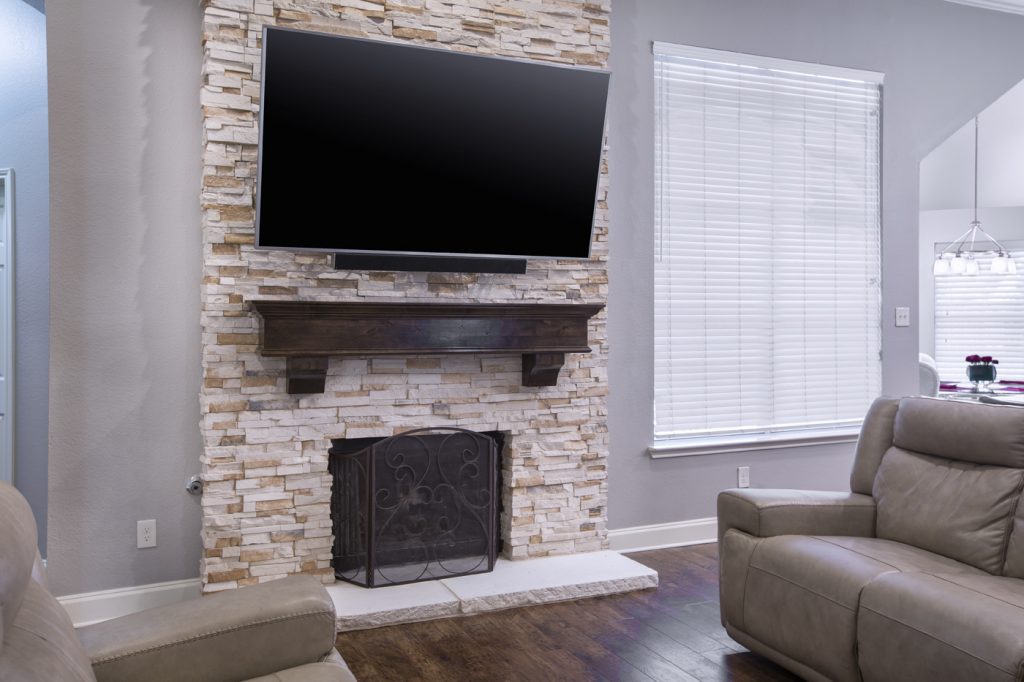 You can also see that we installed the same vinyl plank flooring we used in the kitchen across the living room to create a more open, flowing feel. The client also wanted a display area in the living room, so we installed a custom built-in bookshelf with backlighting where framed photos can be displayed.