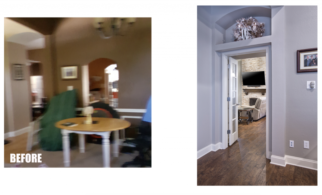 As mentioned, we closed in the walkway from the dining room to the kitchen to provide for the new pantry. Now, upon entering the front door, guests are greeted by the formal dining room and the beautiful French doors we installed at the entrance to the living room. From the French doors, you can see the gorgeous new fireplace we installed before turning the corner to the new kitchen.