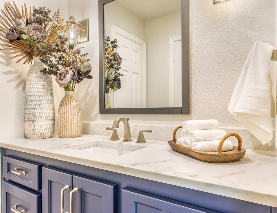 Our clients loved the selection items we used in their master bathroom, so they wanted to match it as best as possible. The shaker-style cabinets, brushed nickel hardware, and blue and white paint colors replicate what was used in the master bath.
