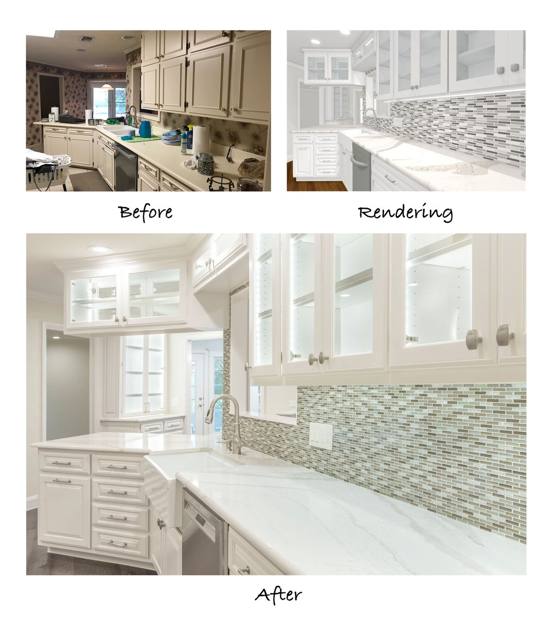 The main structural difference you can see in the before and after floor plans is the addition of cabinetry in the breakfast nook, converting the space into a butler’s pantry. Along with updating the existing cabinets throughout the kitchen, our designers included new upper cabinets above the peninsula and pass-through window. These changes don’t appear to make much of a difference to the floor plan, but they make all the difference in the world within the finished kitchen!