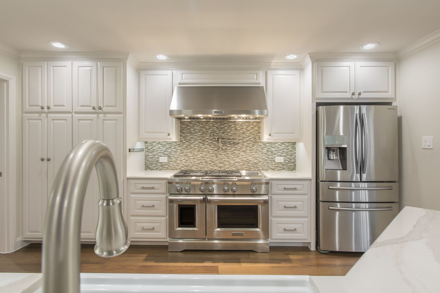 A gorgeous 4-foot double oven gas range is a stunning focal point in the remodeled kitchen. A matching industrial vent hoot was installed above the new range, with 1200 CFM to quickly pull any gases, smoke, or steam from the cook area. Of course, you can’t install a range and vent hood like this without a convenient pot filler! The clients no longer have to carry full, heavy pots across the kitchen from the sink prior to cooking.