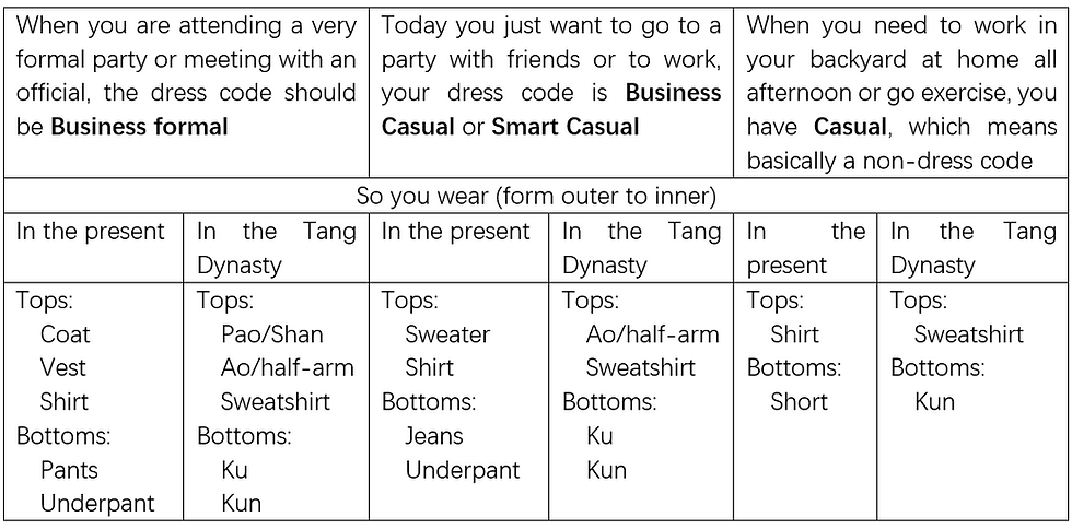 Now, doesn't everything seem so much easier? Just correspond with the modern dress code one by one, and you will know how you should dress in Tang Dynasty. As an ordinary male who did not need to attend major ceremonial occasions, you could spend a winter and spring in the Tang Dynasty in peace by having the knowledge above.