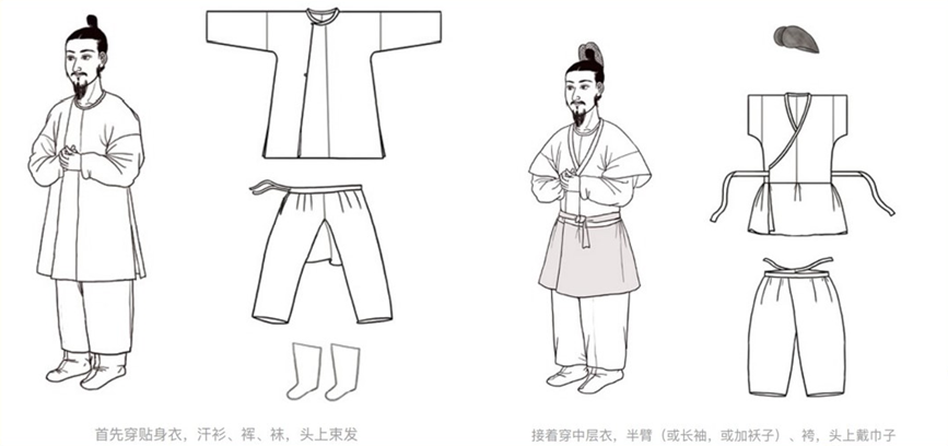 In summary, the complete hierarchy of everyday men's clothing in the Tang Dynasty, from the inside out, was the inner layer of clothes: sweatshirt and Kun, the middle layer of clothes: half-arm (or Ao) and Ku, and the outer layer of clothes: Pao (or Shan) and Putou. The main differences between the garments of different seasons are the lightness and thickness of the fabric, single or double layers, whether the double layer clothes are filled with Mianhua, and whether there is a middle layer garment. There is no difference in style, and it does not change because of the weather.