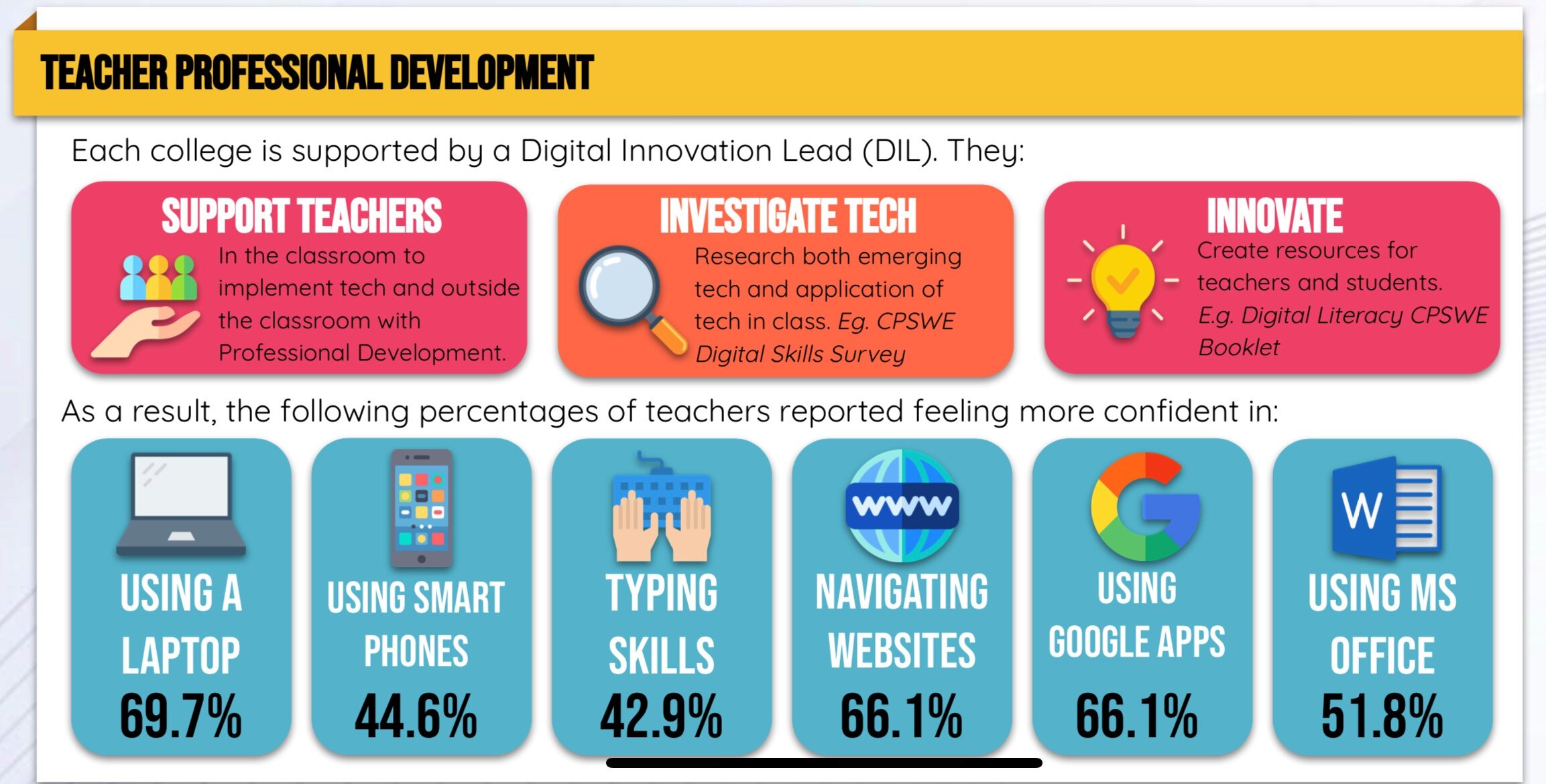 By employing teachers as Digital Leads to provide support to colleagues, we are not only future-proofing their roles, but providing valuable opportunities for teachers to upskill, and to cascade their learning to other teachers. This also fosters a better learning environment for students as teachers approach the tools and platforms used in the classroom, more confidently.