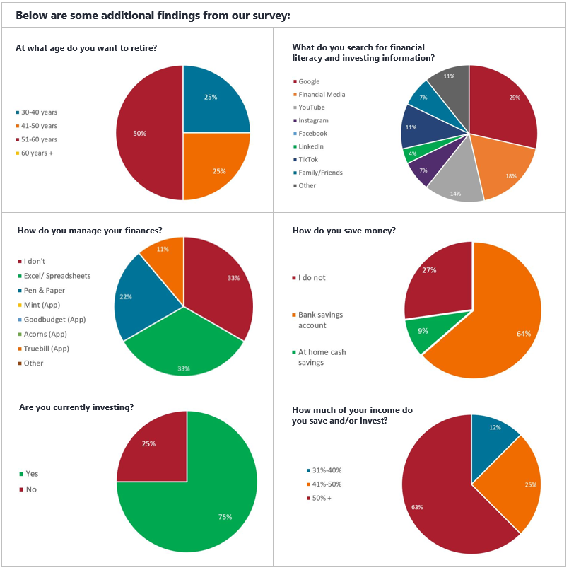 When we think about millennials, Gen Z, or just young people in general, the stereotypical refrain is that they don’t listen, and they think they’ve got it all figured out. But, as this survey and others have shown, this group is generally willing and excited to learn. In our survey, 100% of respondents noted that they knew something about finances but wanted to learn more. Topics that were of most interest included real estate and cryptocurrencies, but also foundational ideas like retirement accounts and long-term financial planning.