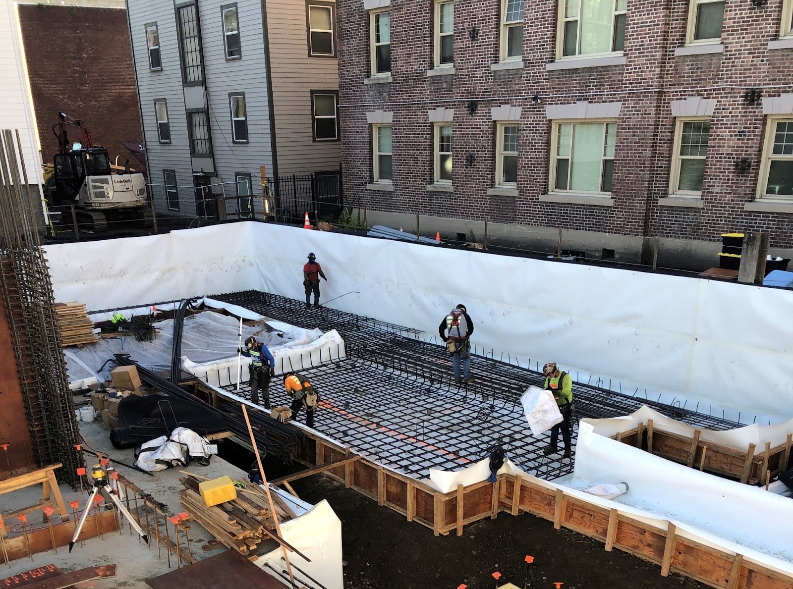 EPRO stepped in with the right products and expertise to advise the team on the best way to protect the site. A total of 47,000 square feet of product was applied: Geo-Seal EV40s with passive low-profile venting for vapor mitigation; e.base, e.spray, Geo-Seal Bond B at the elevator pits; 12,500 square feet of E.Proformance Slip Sheet at shoring for the blindside walls, and 7,500 square feet of the post-applied E.Proformance Wall system for the double-formed walls.