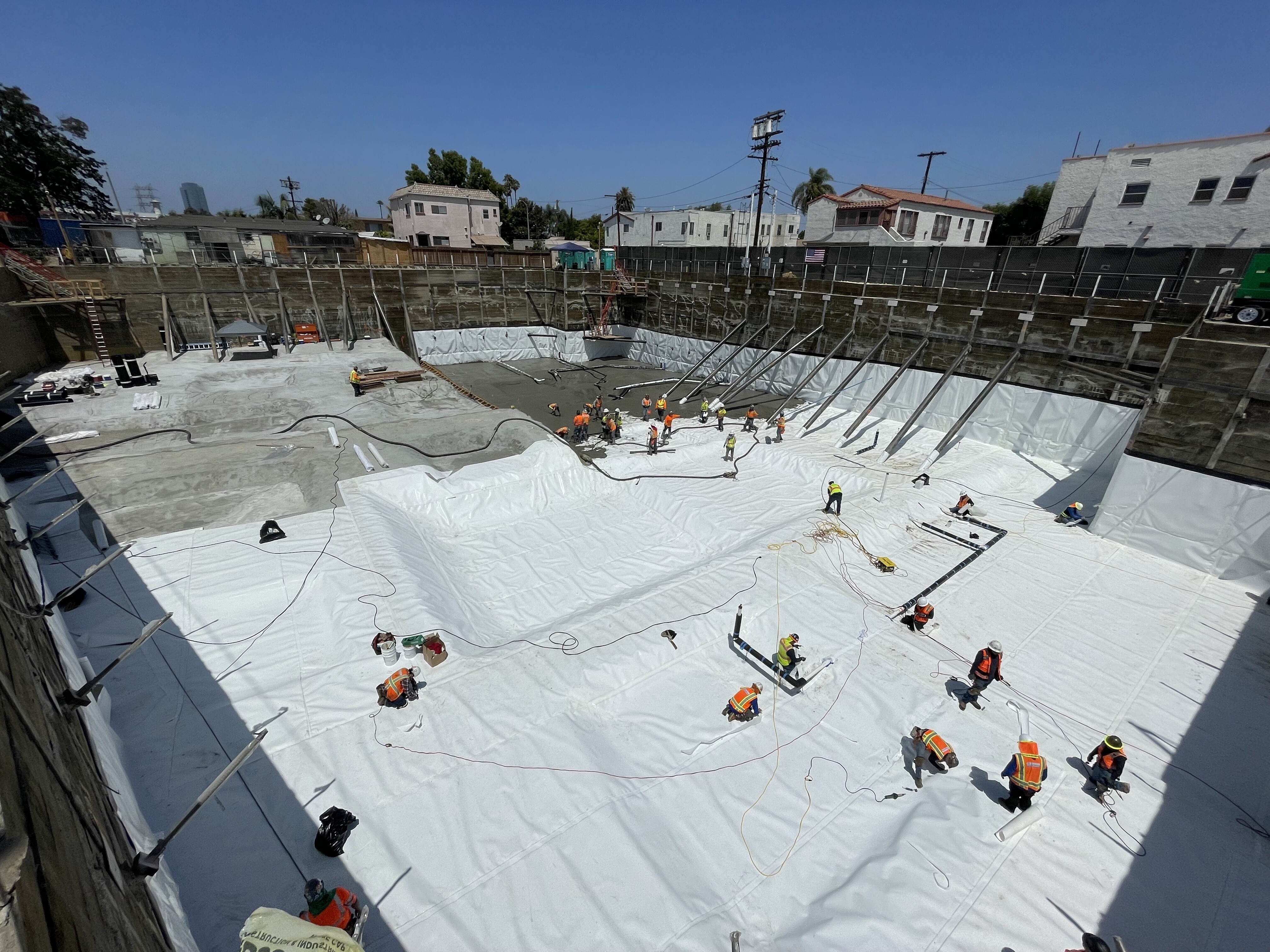 EPRO’s PreTak membrane was determined to bet the ideal solution and was installed at all underslab locations directly over compacted fill and vertically against the soldier pile lagging support of excavation (blindside waterproofing). The blindside assembly consisted of EPRO’s e.drain drainage composite with embedded filter fabric against soldier pile lagging with PreTak mechanically fastened to the lagging.