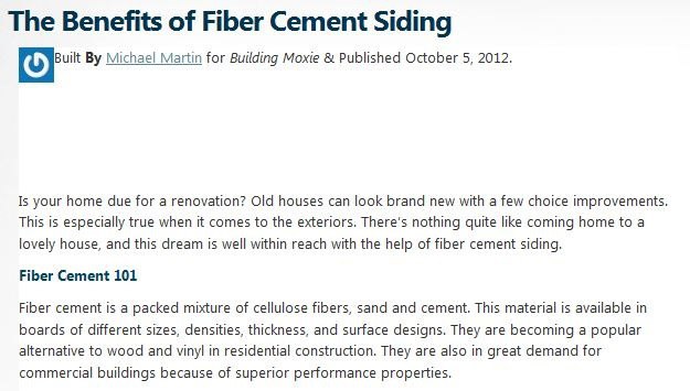 (Article Excerpt and Image from The Benefits of Fiber Cement Siding, Building Moxie, Published October 5, 2012)