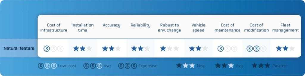 Similar to vision guidance, natural feature technology is simple to install because it requires minimal infrastructure changes. At most, a few reflective stickers might be needed if an area has very few natural features.