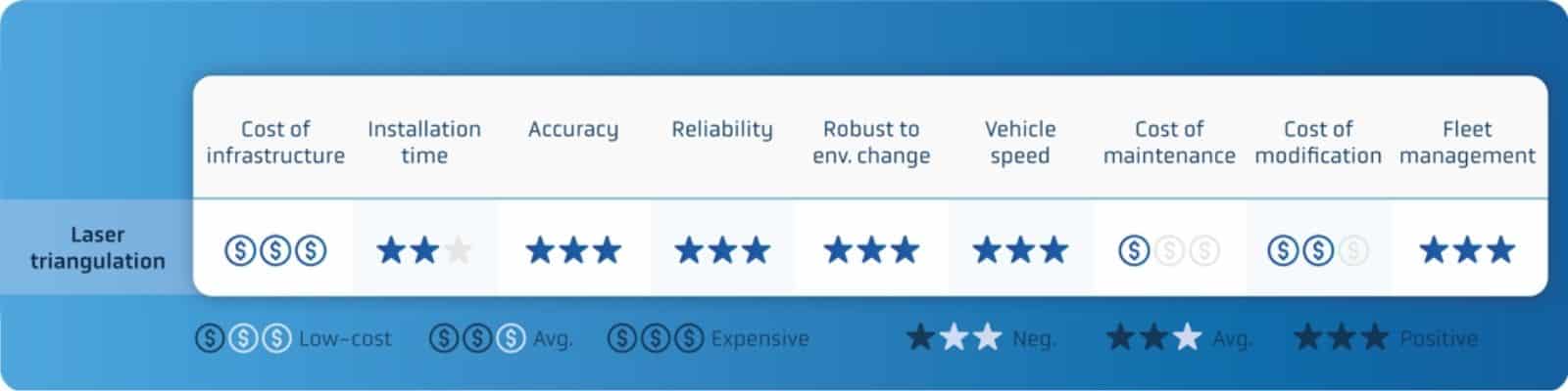 As with line-following, laser triangulation technology is exceptionally reliable. It is capable of high positioning accuracy (required for efficient picking, dropping, and vehicle charging), and relatively fast vehicle speeds are possible.