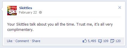 Are those the kinds of posts you’d expect to see from a candy company? Definitely not. But they work well for a company whose current slogan is “Taste the Rainbow.” So what exactly is Skittles doing right?