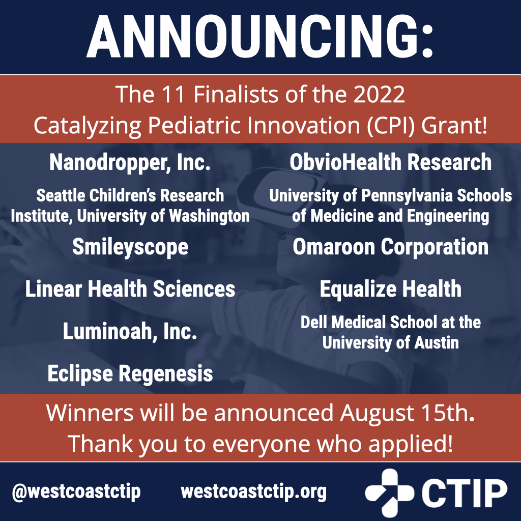 LOS ANGELES, CALIFORNIA - JUNE 13, 2022 - Now in its sixth year, the CTIP Catalyzing Pediatric Innovation Grant remains competitive. CTIP received numerous Letters of Intent for our 2022 Catalyzing Pediatric Innovation Grant and is excited to share the many innovative products and concepts submitted for application in the pediatric medical device space.