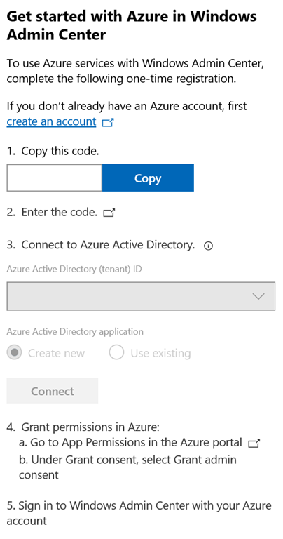 From there you will have to sign-in to your Azure tenant by logging on with a one time code; this will register Windows Admin Center to your Azure AD
