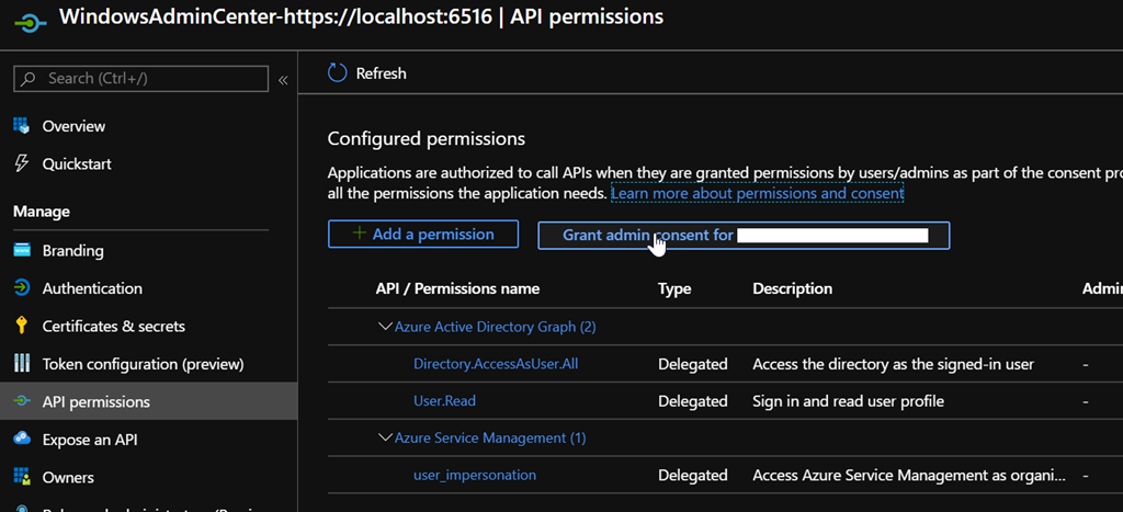 Once the application is created, you will need to grant the Grant Admin Consent permission from the API Permissions