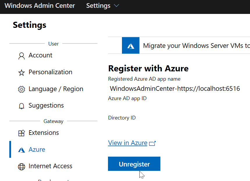 If you need to reset or unregister Windows Admin Center from the Azure Security Center, access the Windows Admin Center Settings and go to GatewayAzure to unregister