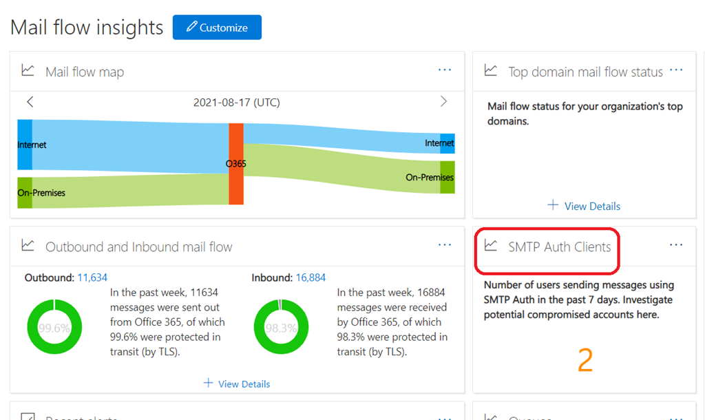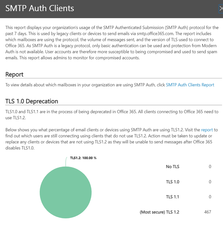 To help you identify these legacy clients use the Mail Flow dashboard and report SMTP Auth Clients, which has been available for quite some time now, from the Security & Compliance portal (https://protection.office.com/mailflow/dashboard)
