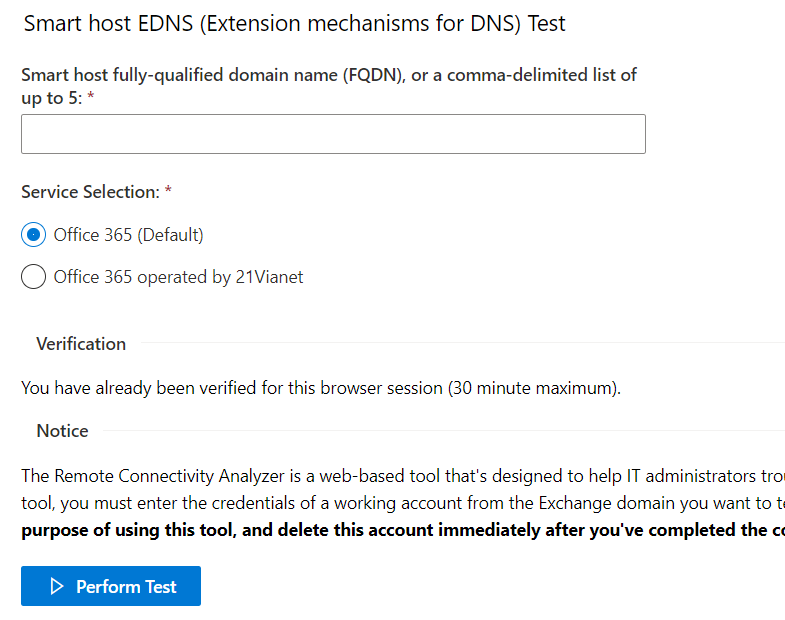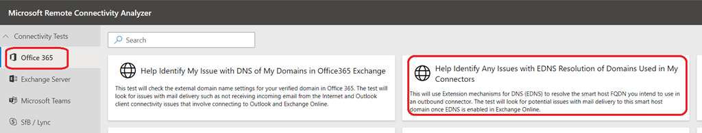 You can access the EDNS validation tool from the RCA home page, under the Office 365 blade, or through the direct link https://testconnectivity.microsoft.com/tests/O365ResolveSmarthost/input