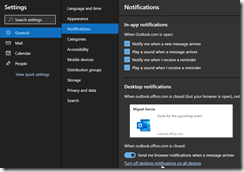 After turning the option on, you may get a prompt from your browser asking confirmation to allow outlook.office.com to Show notifications