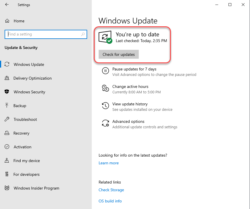 On the target computer, navigate to the Security Update setting and make sure that Windows 10 is up to date. If it is not, then click on the “Check for Updates” button and install the latest updates (you may have to restart your computer for the updates to complete their installation process). Repeat this until there are no more updates to install.