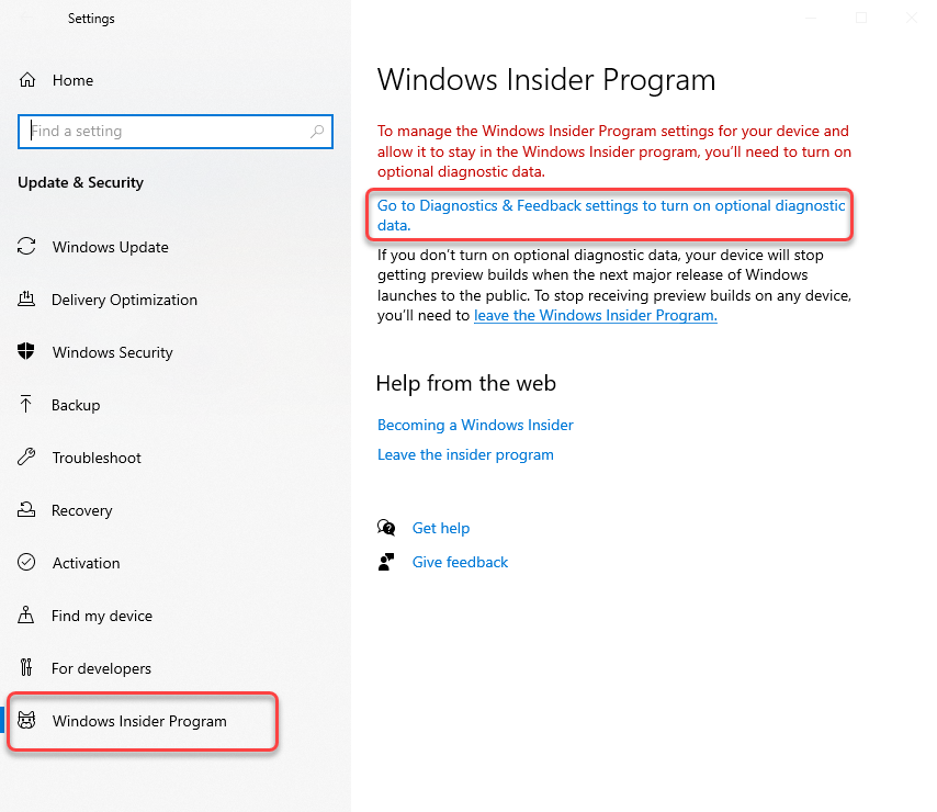 Then go to the Windows Insider pane which is located in Settings > Updates & Security > Windows Insider Program. If you get a message that you need to “turn on optional diagnostics data”, click on the provided link.