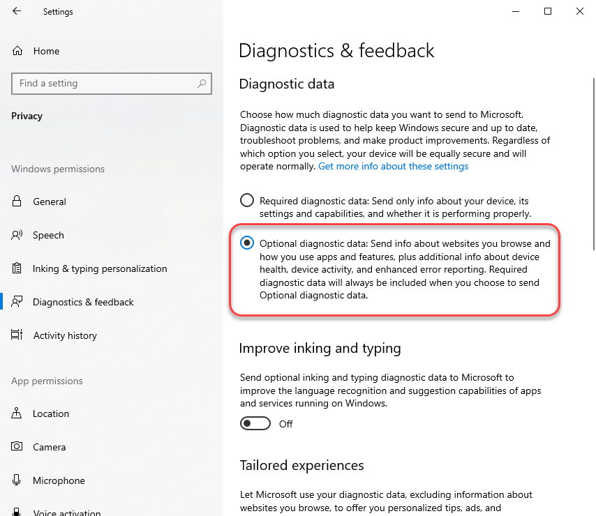 Click on the second radio button to turn on the Optional Diagnostic Data