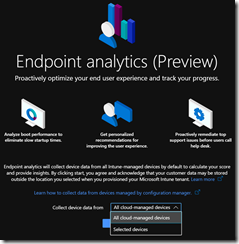 To start using Endpoint Analytics you first need to enable it by accessing the following URL (this is not yet available directly from the Intune/Endpoint Configuration portal) https://aka.ms/endpointanalytics