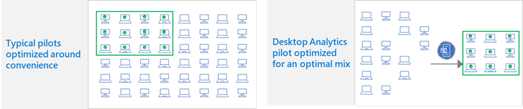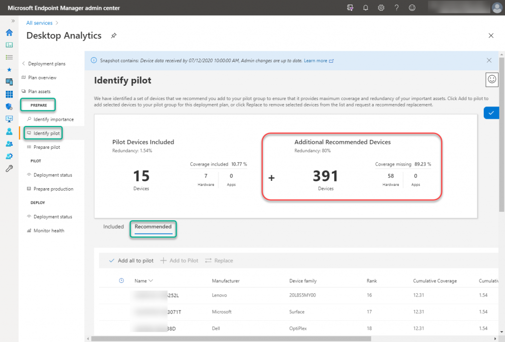 The second step is to identify which devices you’ll elect for your pilot. This is an important step as Microsoft has added a great functionality here: “Additional Recommended Devices”. As much as they possibly could, to test the new OS, many IT departments would select systems based on convenience. However, they could not guarantee if their selection accurately represents the majority of the organization’s fleet. With the “Additional Recommended Devices” functionality, Desktop Analytics uses Artificial Intelligence to suggest a number of devices to include in your Pilot phase in addition to the ones you have selected. As a result, the Pilot group is closer to a true representation of your organization’s global group of systems. So much so that Desktop Analytics also provides a percentage of what is covered by your selection and by the recommended selection.