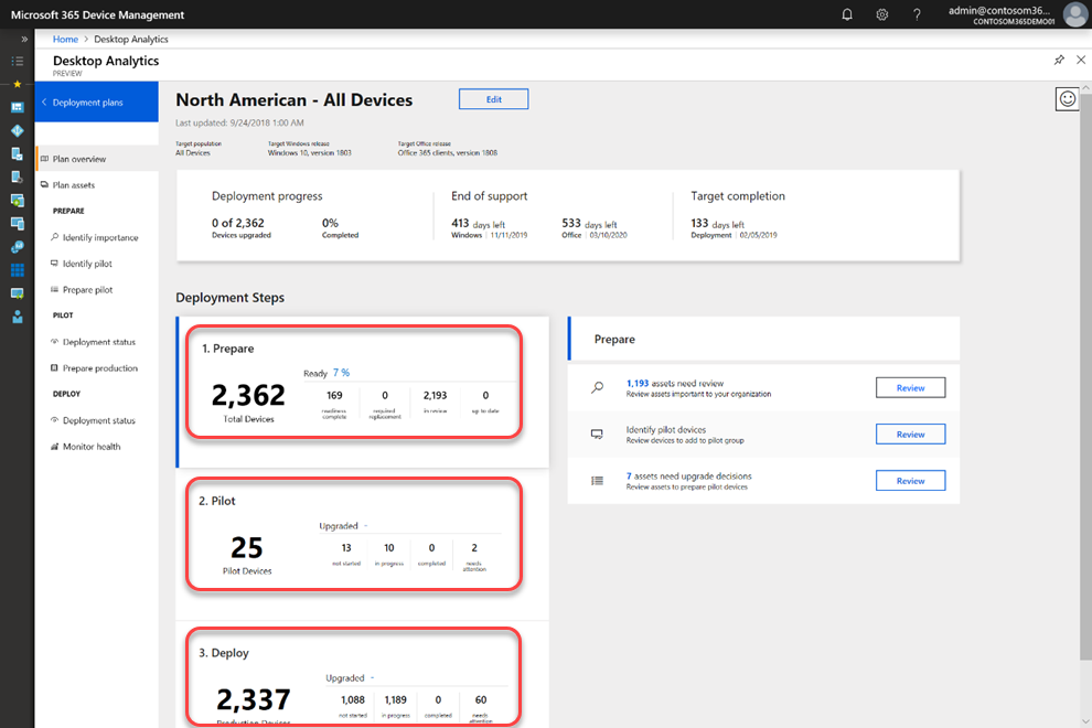 We’ve seen from part 5 of this series that there are 3 deployment rings: Insider, Pilot and Broad. In Desktop Analytics (DA), for each Deployment Plan there are also 3 major phases – Prepare, Pilot and Deploy – and each phase has a number of steps to follow.