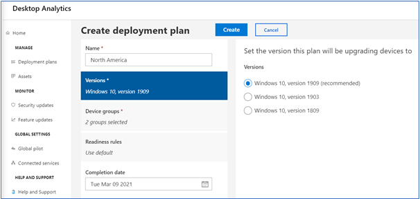 From here, you’ll need to create one or more Deployment Plans (https://docs.microsoft.com/en-us/configmgr/desktop-analytics/create-deployment-plans). When you create a MEM DA deployment plan, you are essentially selecting a group of devices that you are targeting for a Windows 10 upgrade to a specific build. The “Create Deployment Plan” wizard asks you to enter a name for your plan, the version that the plan will be upgrading devices to, one or more groups of devices that will be targeted (selected from the list of collections that you’ve included during the MEM DA integration with MEM CM), and the target completion date; the latter will help you stay on course.