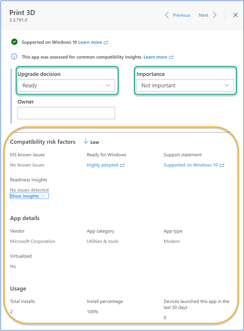 Setting the Importance and the Upgrade decision of each app is an important step because, depending on the assessment you select, some devices that have that particular app installed will be included in the Pilot deployment. If an App is market as ‘Critical’ or ‘Important’, Desktop Analytics includes in the pilot deployment some devices with that app. However, if you choose ‘Not reviewed’ or ‘Unable’ in the Upgrade decision, then Desktop Analytics doesn’t include devices with this app in the pilot deployment. More information on Upgrade decision and Importance assessments are detailed here:
