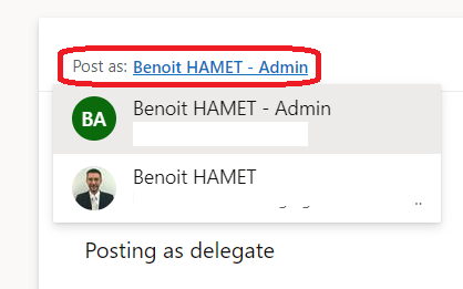 Once you have delegated, the delegates can then post on your behalf but not react (like, thanks…) by using the Post as option available on top of the conversation window