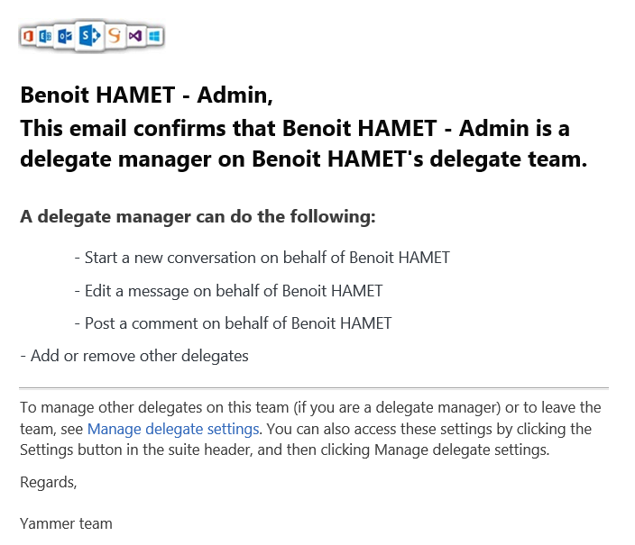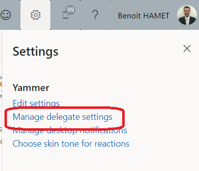 If you want to enjoy this new feature, connect to your Yammer network (https://web.yammer.com/) and access your settings menu (the gear button available top right of the window) to select Manage delegate settings