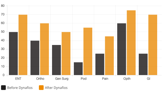 The hospital contracted with Dynafios to create a program to engage physicians and reverse volume erosion at the Naugatauk Valley Surgical Center (NVSC). A Dynafios co-management agreement was created with the hospital and 16 physicians in ENT, Orthopedics, General Surgery, Podiatry, Pain Management, Ophthalmology and GI. Key performance indicators were agreed upon and data analytics used to monitor and measure progress.