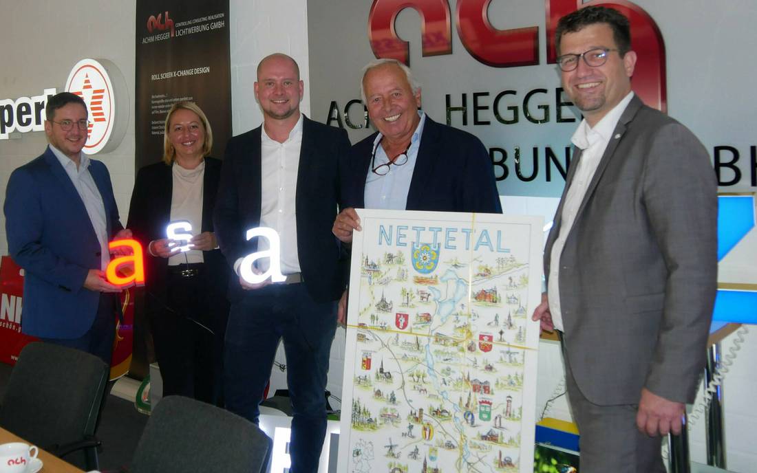 „Nettetals Bürgermeister Christian Küsters, Wirtschaftsförderer Hans-Willi Pergens sowie Kerstin Duve vom Unternehmensservice der Stadt Nettetal haben sich bei Unternehmensbesuchen jetzt auch bei der Achim Hegger Lichtwerbung GmbH in Kaldenkirchen umgesehen…“