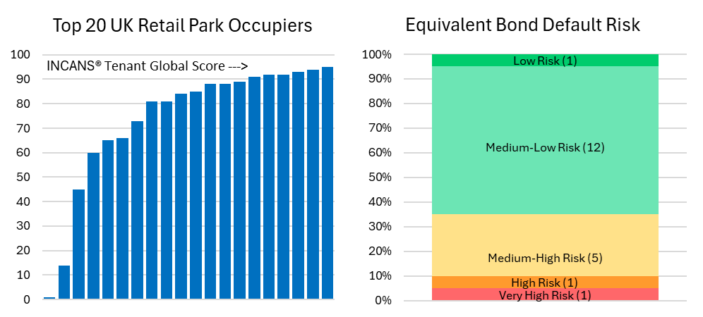 However, this is where it becomes important to look at the mix of risks across the top 20. It may surprise you. The left-hand chart shows the distribution of the risks across this group, with some occupiers facing a much greater probability of default than others. The right-hand chart shows the equivalent bond default risk across the same group. Just 1 of the top 20 fall into the Low Risk category, though good news for investors in this sector, 12 are Medium-Low Risk. That means 65% of the top 20 occupiers would be considered at little risk of defaulting on their leases. Landlords just need to worry about the remaining 35% who find themselves at more risk of struggling to meet their lease obligations in the future.