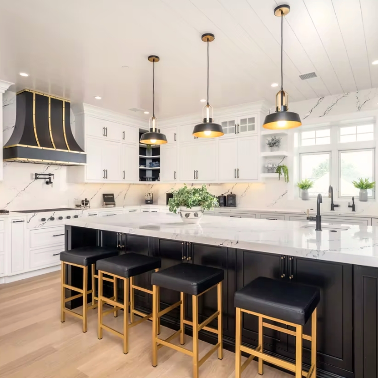 Large Kitchen Island: A spacious kitchen island is a must-have. It serves as a prep area, dining space, and gathering spot for guests. Choose a durable countertop material like Cambria brand Quartz, which is both stylish and practical for frequent use.