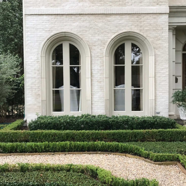 Black window trim on a brick house: