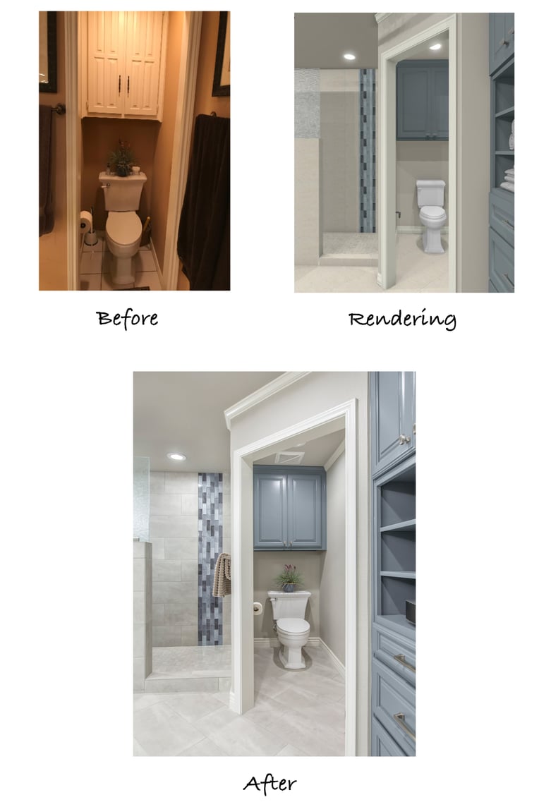 The rendering and after photo show what a drastic change was made! Converting this side of the bathroom to the “his” side, we were able to replace the large vanity with a single 36-inch “man-sized” version (still with plenty of drawers and storage space for him!) The extra space from the removed vanity created the perfect area for a large walk-in shower.