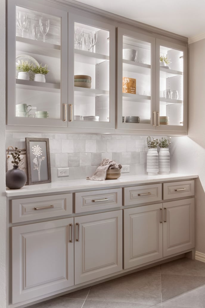 The original breakfast nook included dated built-ins that needed to be replaced. The client knew she wanted a modern display area for dishes and décor, so glass-front cabinets were a great choice.