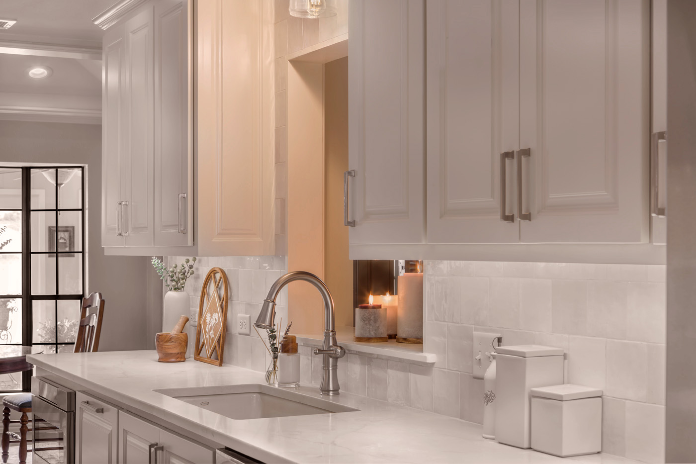 A glossy pearl-toned porcelain tile was selected for the backsplash, which paired beautifully with the quartz countertop.