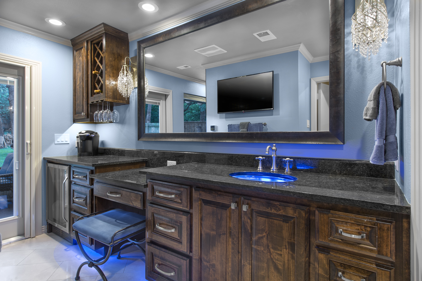 A set of three custom individual mirrors were installed above the vanity, separated by modern wall sconces and showcasing the beautiful stain that reaches to the ceiling. Matching crown moulding was also installed around the room, really pulling the space together.