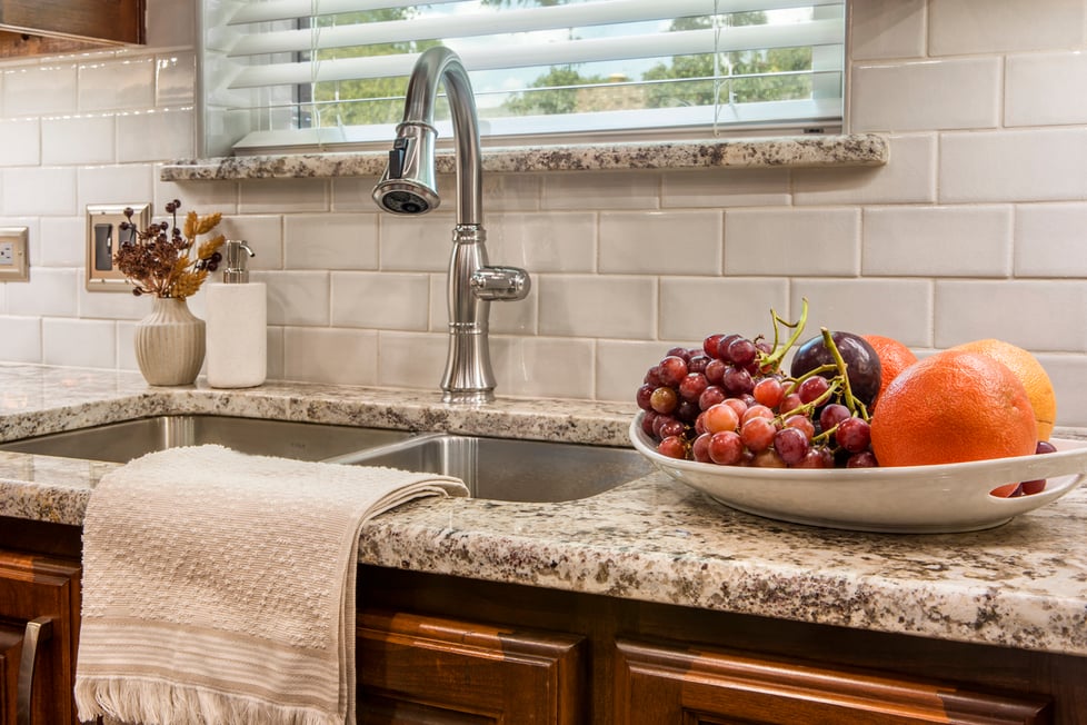 A Stainless-Steel double-basin under-mount sink was installed with a matching new faucet in place of the old one. The backsplash tile behind the sink was installed up to the ceiling to make the wall feel taller and draw the eyes upward. You’ll also notice the detail of the granite used as the window ledge; this is just another small detail that elevates this design for a truly luxurious finish!