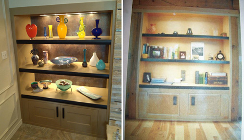One of our clients asked us to do away with her bar area and build her a display case for her glass art. She had a concept picture (above right) which we worked from. As the pictures show, a great team effort with design, creation and installation produced a great display case. We design and custom build any type of cabinetry; let us help you with your dream project!