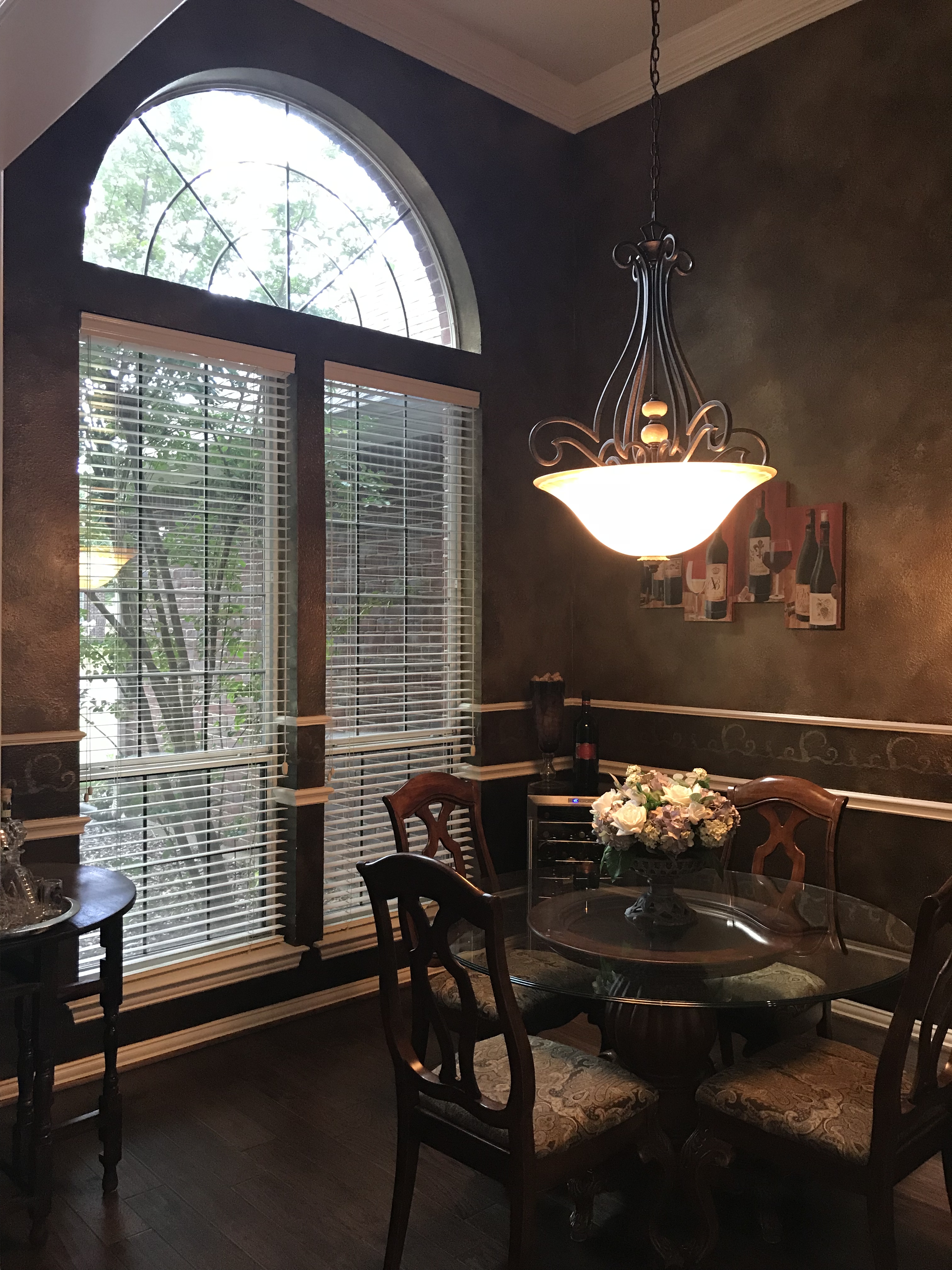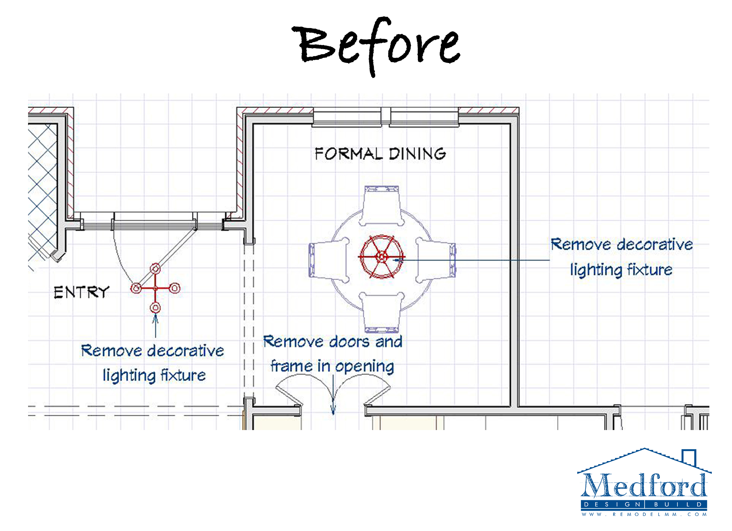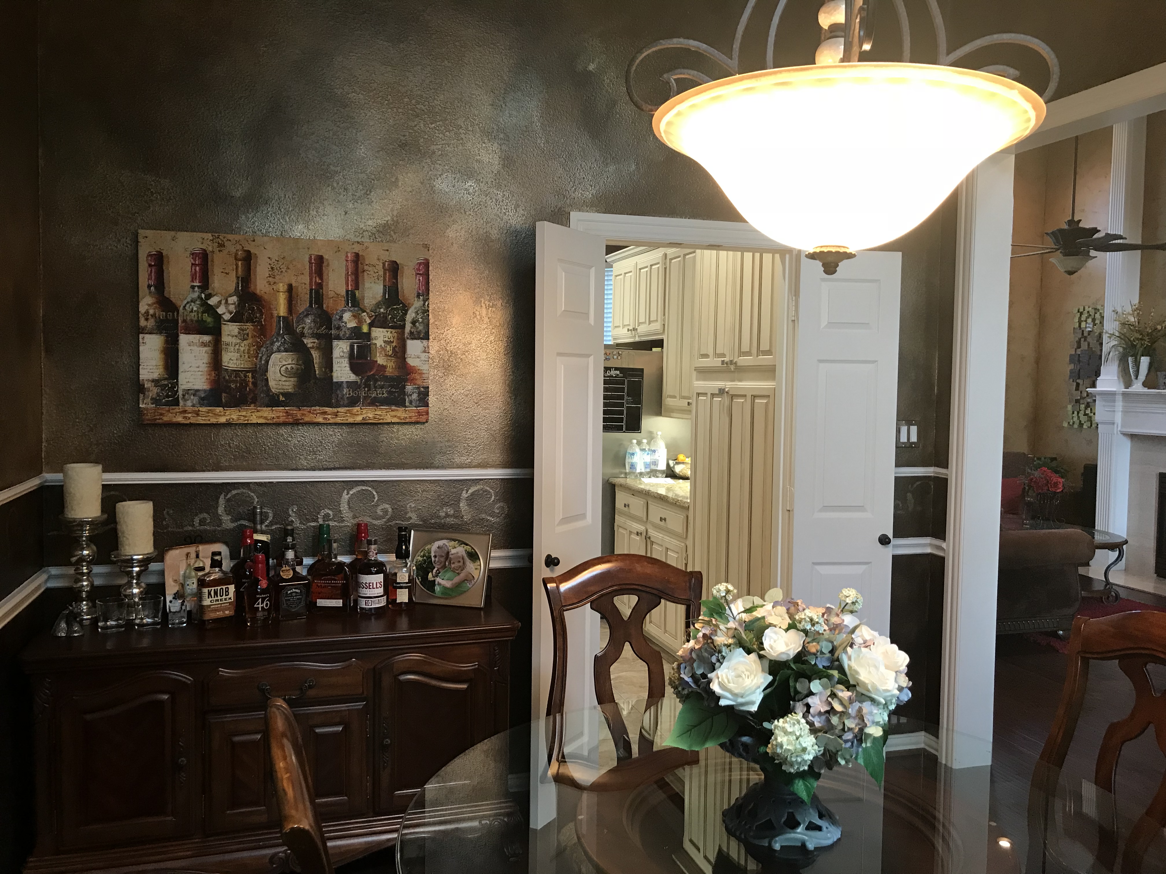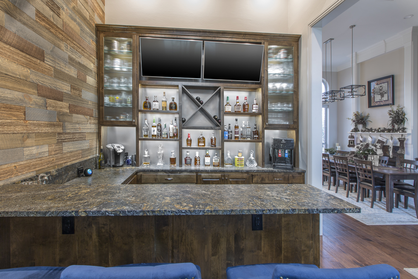 Our recent clients loved to host get-togethers of large groups of people in their home. They enjoyed socializing and desired a place guests could sit, mingle, have a few cold ones, and watch the game. As large as the existing living room was, it just didn’t meet the needs of the clients when it came to entertaining guests. The idea was brought up to convert the formal dining room into a rustic home bar — complete with backlit display shelves, an under-counter wine fridge, granite counter tops, and big screen TVs — and the clients were beyond excited! Our talented design team began to draft up ideas for the look and functionality of the remodeled room, and the project was quickly underway.