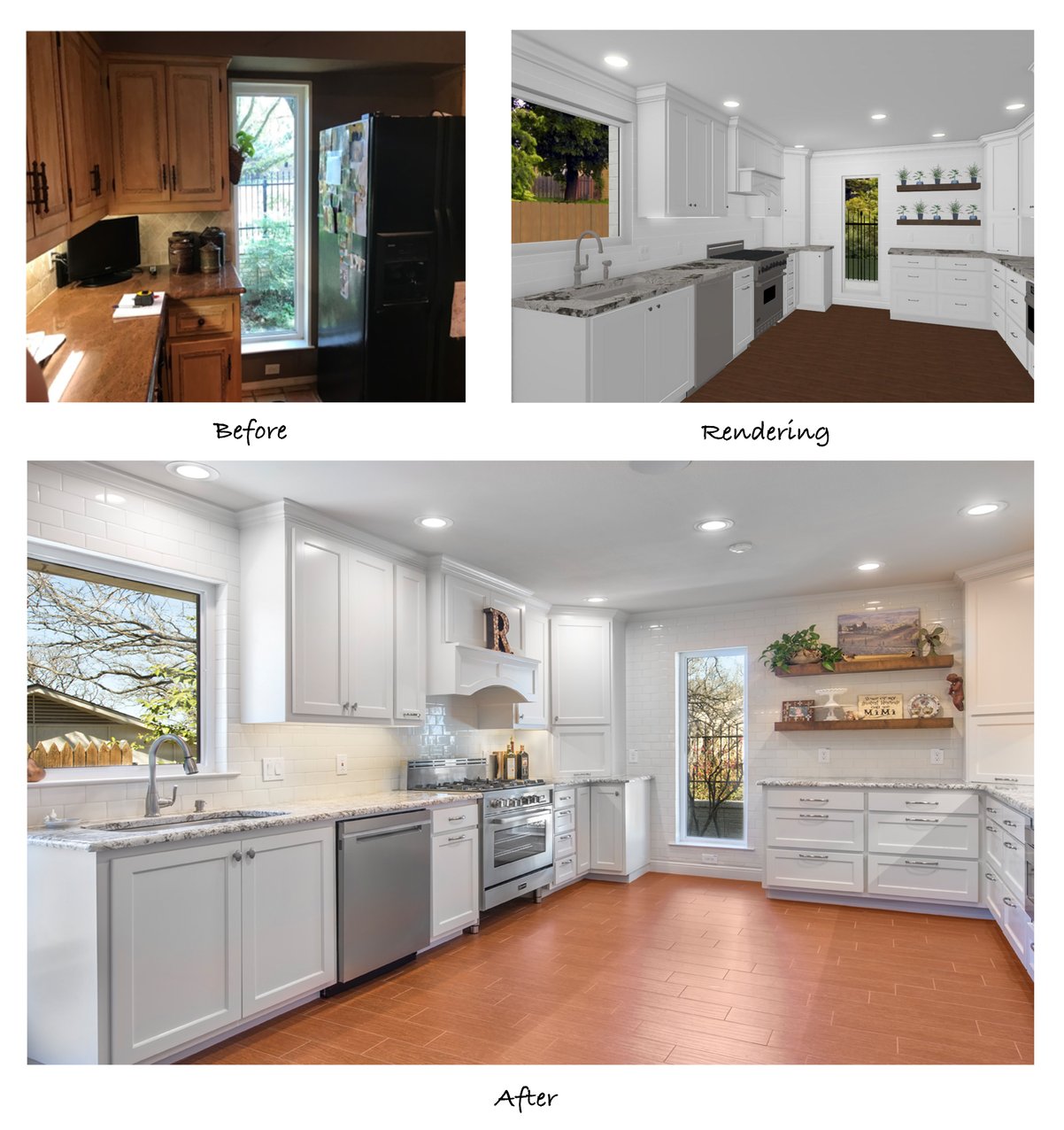 In these before shots, you can see the angled wall with the pass-through over the sink which overlooked the enclosed porch just off the kitchen. The after photos shows where we removed the angled wall, extended the cabinetry down the new wall, and installed a window over the new sink. Not only did the kitchen and breakfast area gain some square footage from the porch, but the extension of the new cabinets reaching all the way to the ceiling makes the walls seem taller. The bright white paint and strategically placed LED can lights add to the bright, polished finish.