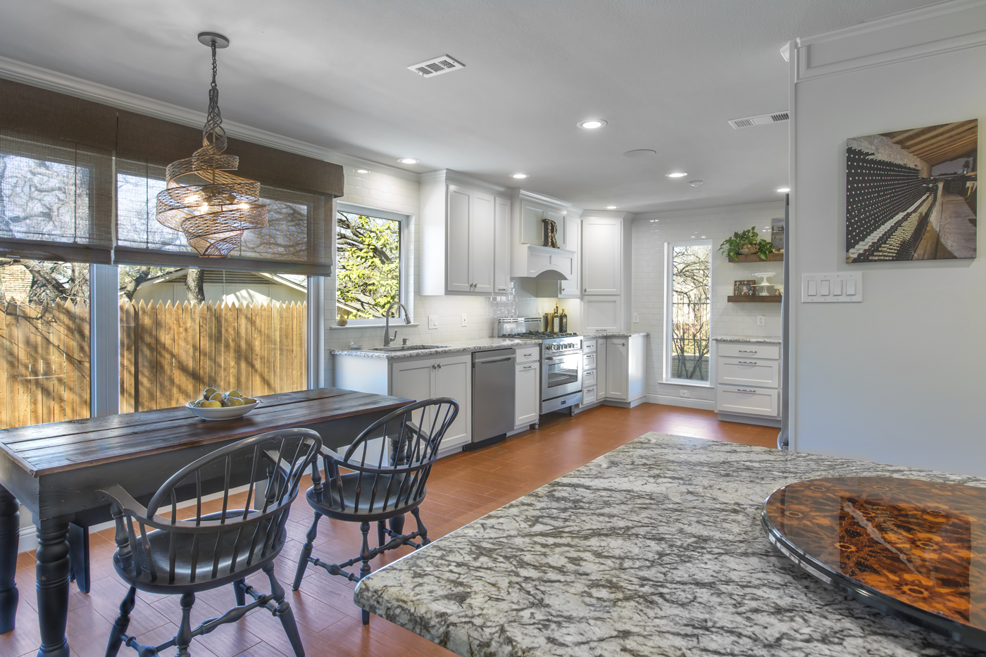 This view from the end of the bar showcases the new view into the kitchen after the structural modifications have been made. Notice how the far window is no longer obstructed by the refrigerator and the large windows in the breakfast area are also unobstructed. This is one of the key factors in creating a bright, open floor plan.