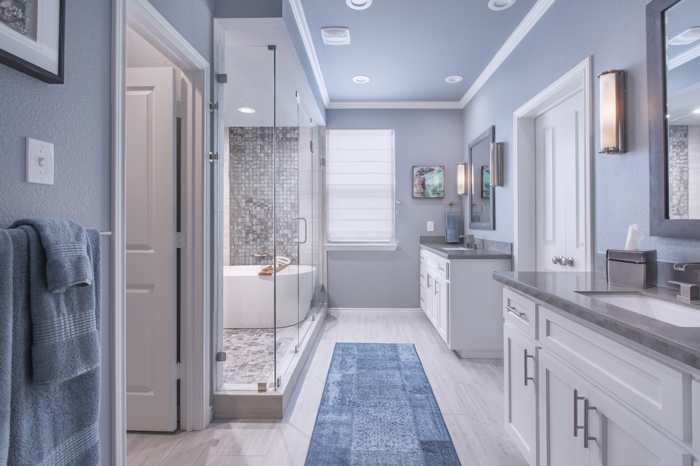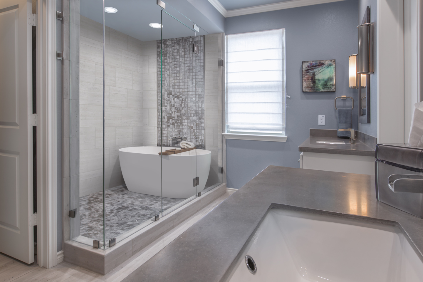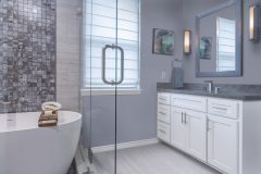 This client came to us with a beautiful home, built in 2016. The original master bathroom included a high-end upgraded shower with stylish tile and modern vanities. While the sleek frameless-glass shower was very large, the bathroom itself was on the smaller side. Upon entering the bathroom from the master bedroom, the shower and toilet room were on the left and two large vanities were on the right, one on each side of the closet door. Structurally speaking, there was not a lot of space to work with; the original layout would have to stay the same. Because the main concern of the client was to somehow incorporate a bathtub into the design, the idea was presented to create a “wet room” within the oversized shower. See the project blog for the full story.