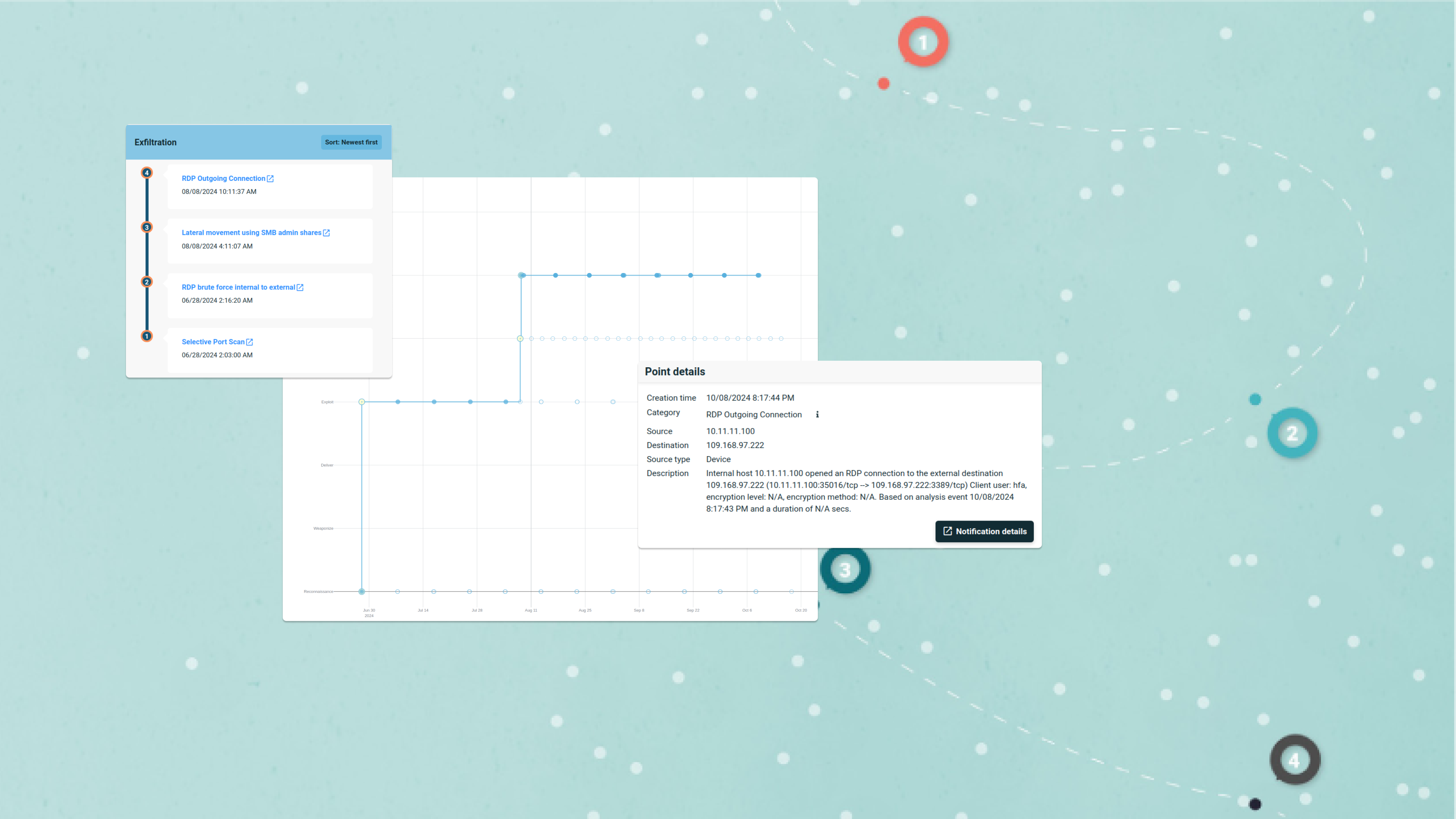 As it reduces the number of false positives, Chain of Events helps your team focus on the bigger picture. Chain of Events doesn’t substitute Muninn’s notifications but transforms them into valuable insights in a sequential chain, so you can identify real risks that fly under the radar before it’s too late.